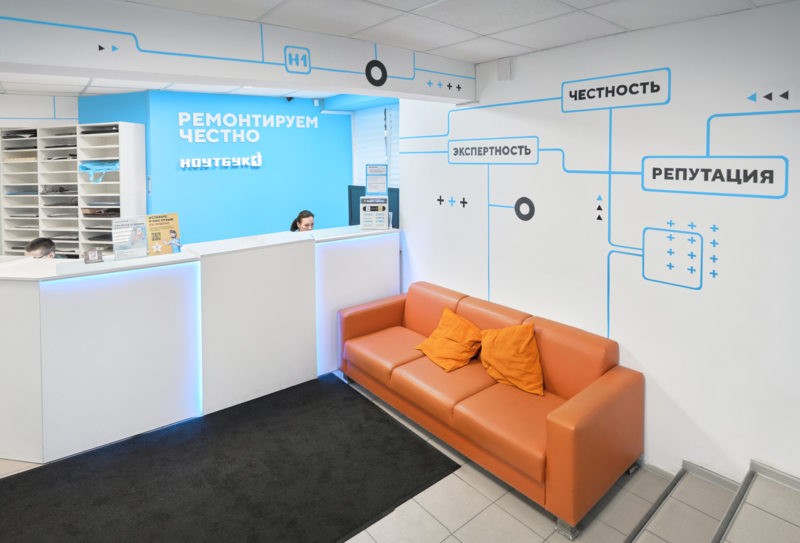 Вход в сервисный центр сразу за вывеской, с фасада здания.